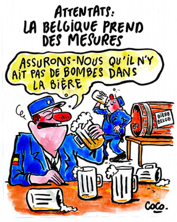 Рисунок под названием "Теракты: Бельгия принимает меры" был размещен на сайте журнала 25 марта. На нем показаны двое полицейских, пьющих пиво. Один из них говорит другому: "Нам нужно убедиться, что в пиве нет бомб".